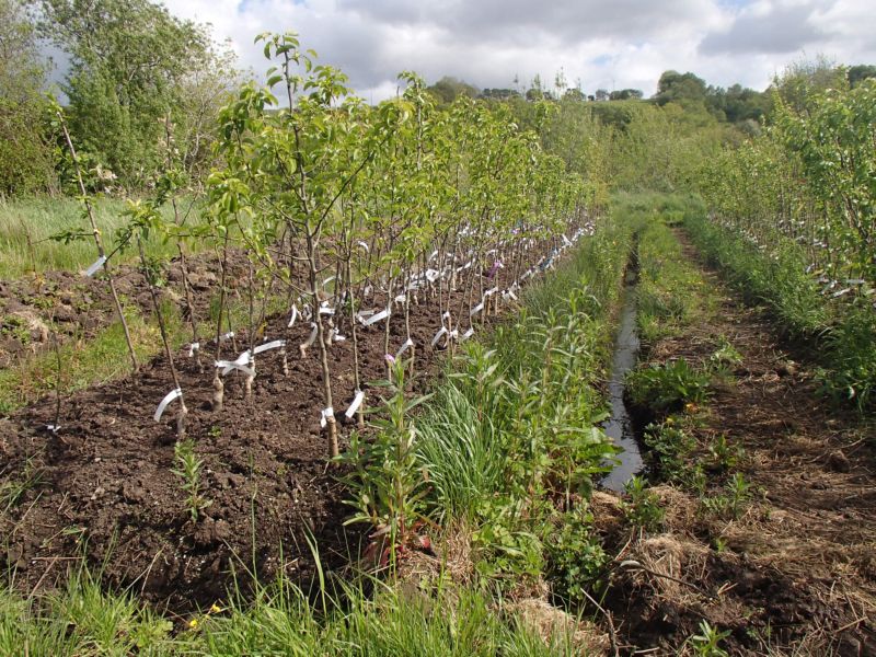In terms of wetness, there is almost no limit to where this style of agriculture can be practised. The wetter the land, the wider the spaces between the ridges and the higher the ridges. Although this field floods in winter, the ridges are sufficiently above the highest 24 hour water level for young fruit trees to flourish. An aesthetically pleasing alternative to long ridges would be islands within the flood plain.
