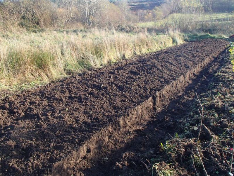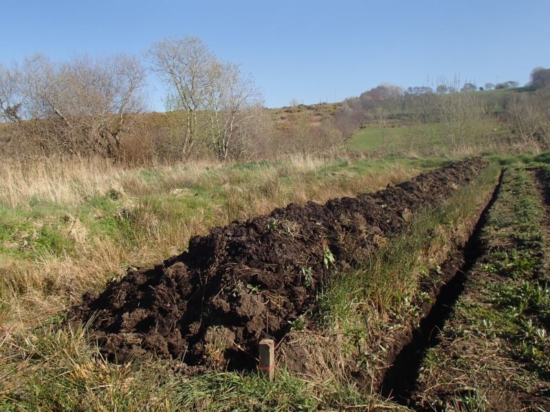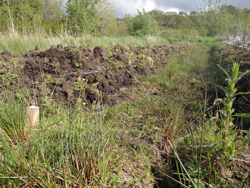 Image: New bed under construction, April 2015. The ridge had been roughly laid out three years previously and was permitted to become colonised by native plants (mainly grasses, rushes and buttercup). The material was a mixture of fibrous peat, silt and clay. However, the raised nature of the ridge allowed it to become more aerated, leading to the decomposition of the more fibrous roots. Three years on, high pressure to the east of Ireland provided the drying conditions necessary to move the project on.. The ridge has been turned over with a spade (well sharpened in advance to facilitate cutting through rushes). Note that the side of the ridge is contained within a barrier of live rushes. The small trench is to facilitate drainage in the space between the ridges (used as an access path). The ridge will be dug a further three to four times within the next few weeks, with ground limestone added between the second and third digs.