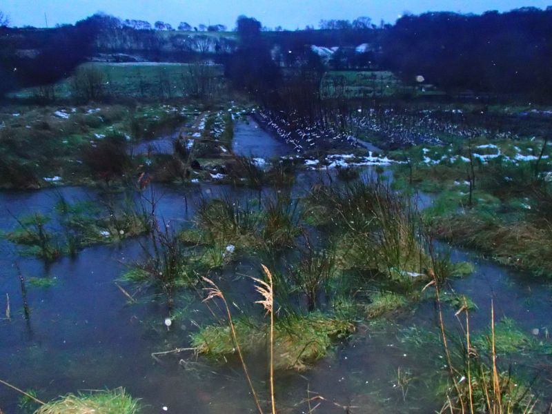 Image: The flood of January 2015. The ridge in the previous photo - now a nursery bed for young fruit trees - is to the immediate right of the wide water-filled ditch. The highest point of the flood - about 30cm higher - was during the middle of the night. While this is certainly challenging terrain, parts of this area are gradually being planted in pear, cherry and cobnut trees, mainly on mounds.