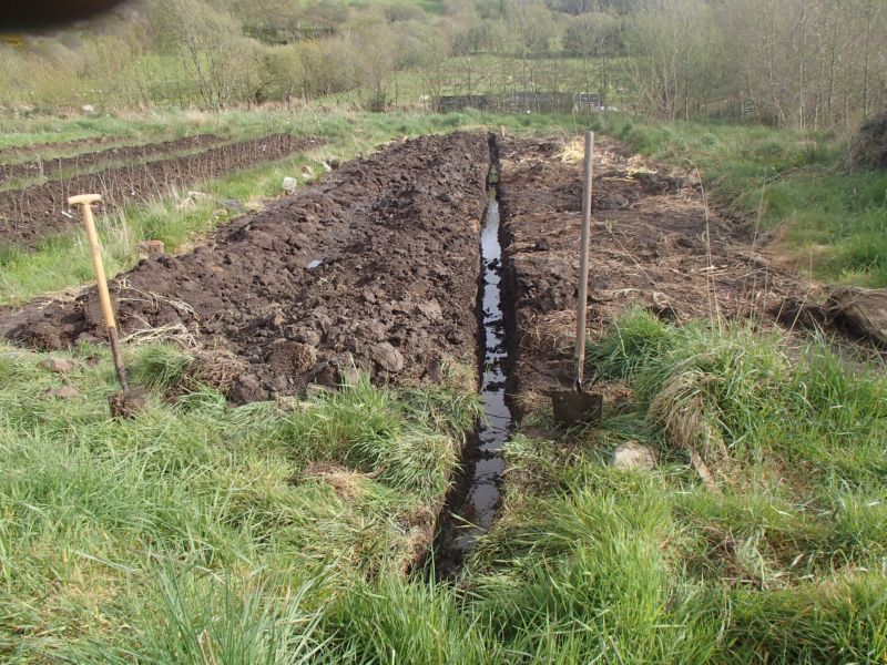 The new ridge will be to the left of the drainage trench. This location is one of the wettest places on the whole site and it is expected the land will take up to three months to dry sufficiently for it to be turned by spade. The initially turning will allow the soil - a mixture of peat, silt and clay - to dry further. As the land dries more, it will be turned again (up to eight or nine times). Previous work of a similar nature at Cooloughra has shown that it is beneficial to let the native plants - primarily reeds, rushes, couch grass and buttercup - regenerate between digs, as the root action will help break up the heavy soil. Also, the digging in of new growth helps enrich the soil. It may be two years before the ridge is ready for planting.