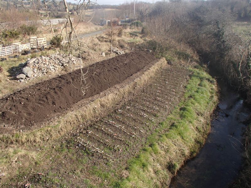 Image: Terraces above the river March 2015. This is the warmest and most sheltered part of the whole site. The land on the northern part of the site had a 2m depth of stones, clay and subsoil dumped on it about ten years ago (thousands of tonnes in total) and is gradually being colonised by scrub vegetation. Before remedial work began, organic content was close to zero. Copious quantities of organic material have now been mixed in. The stones in the pile above the upper of the two terraces - roughly the volume of a small car - were taken out of the beds as they were worked.